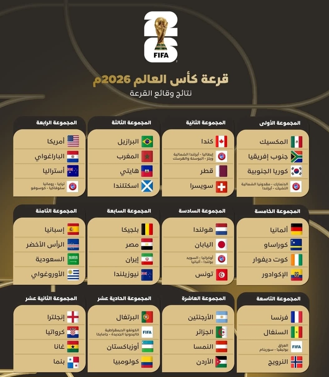 سحبت اليوم قرعة كاس العالم 2026 التي ستقام في الولايات المتحدة والمكسيك وكندا من 11 يونيو/حزيران إلى 19 يوليو/تموز 2026 بمشاركة 48 منتخب تم توزيعهم إلى 12 مجموعة وتضم كل مجموعة 4 منتخبات